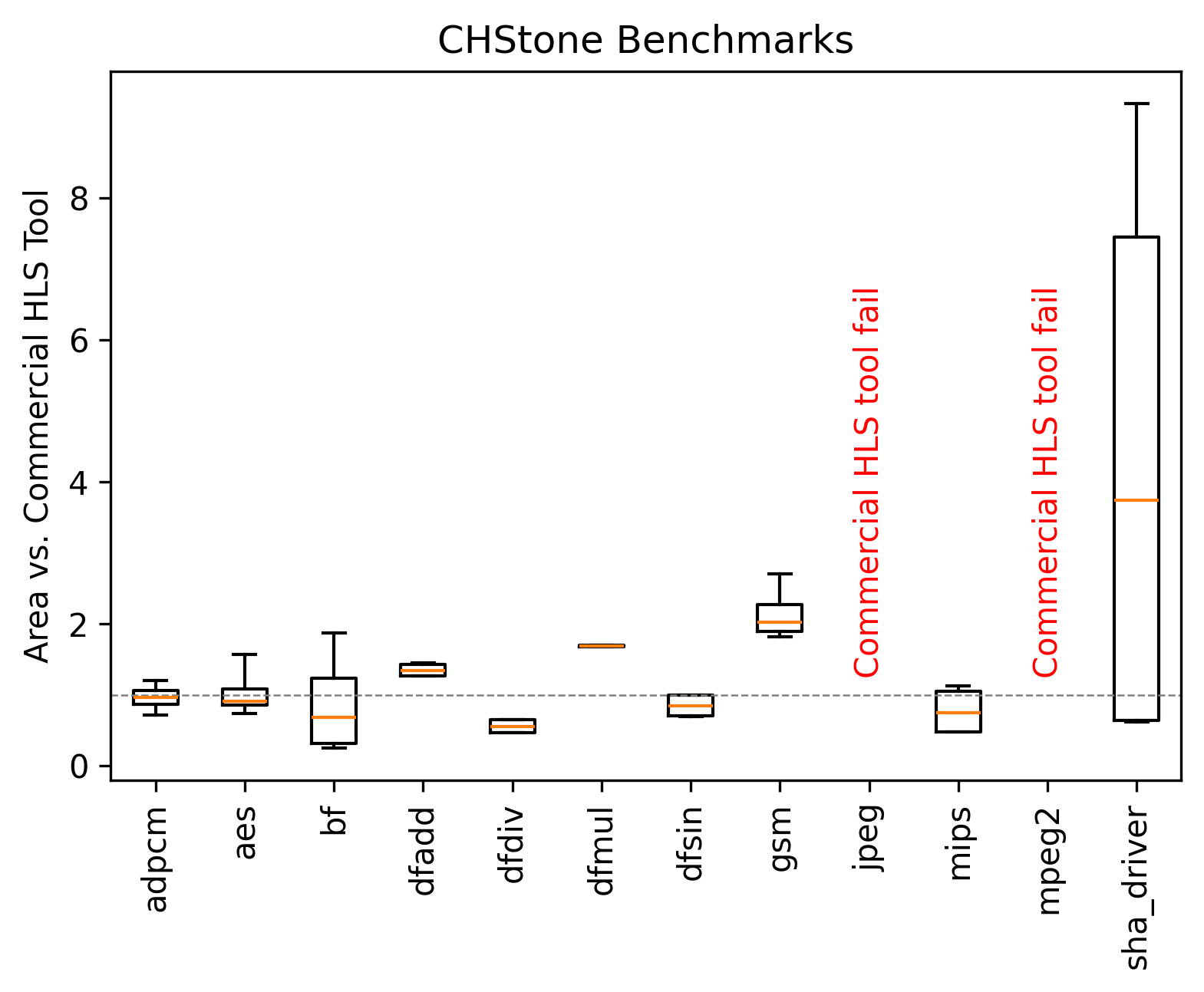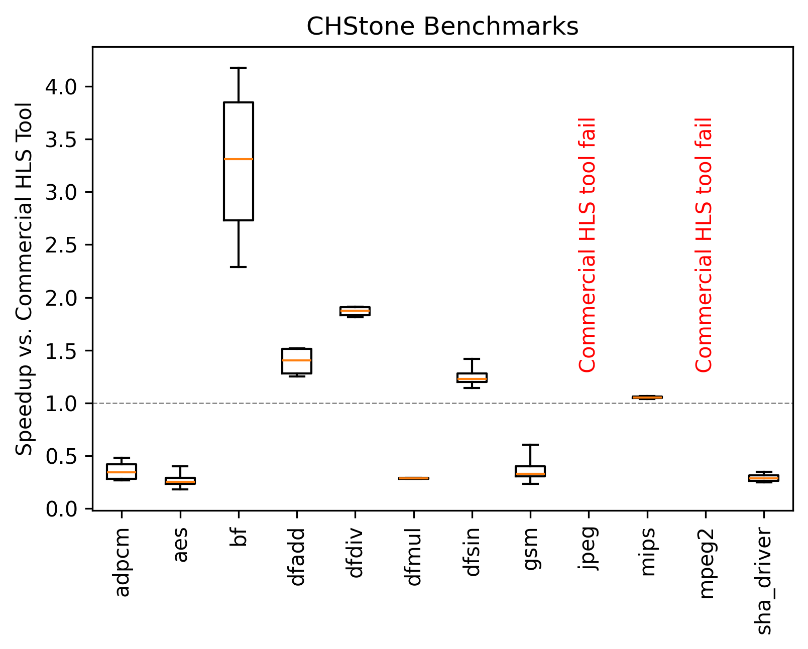 We evaluate accelerators generated by Bambu on the standard benchmark suite CHStone proposed in: