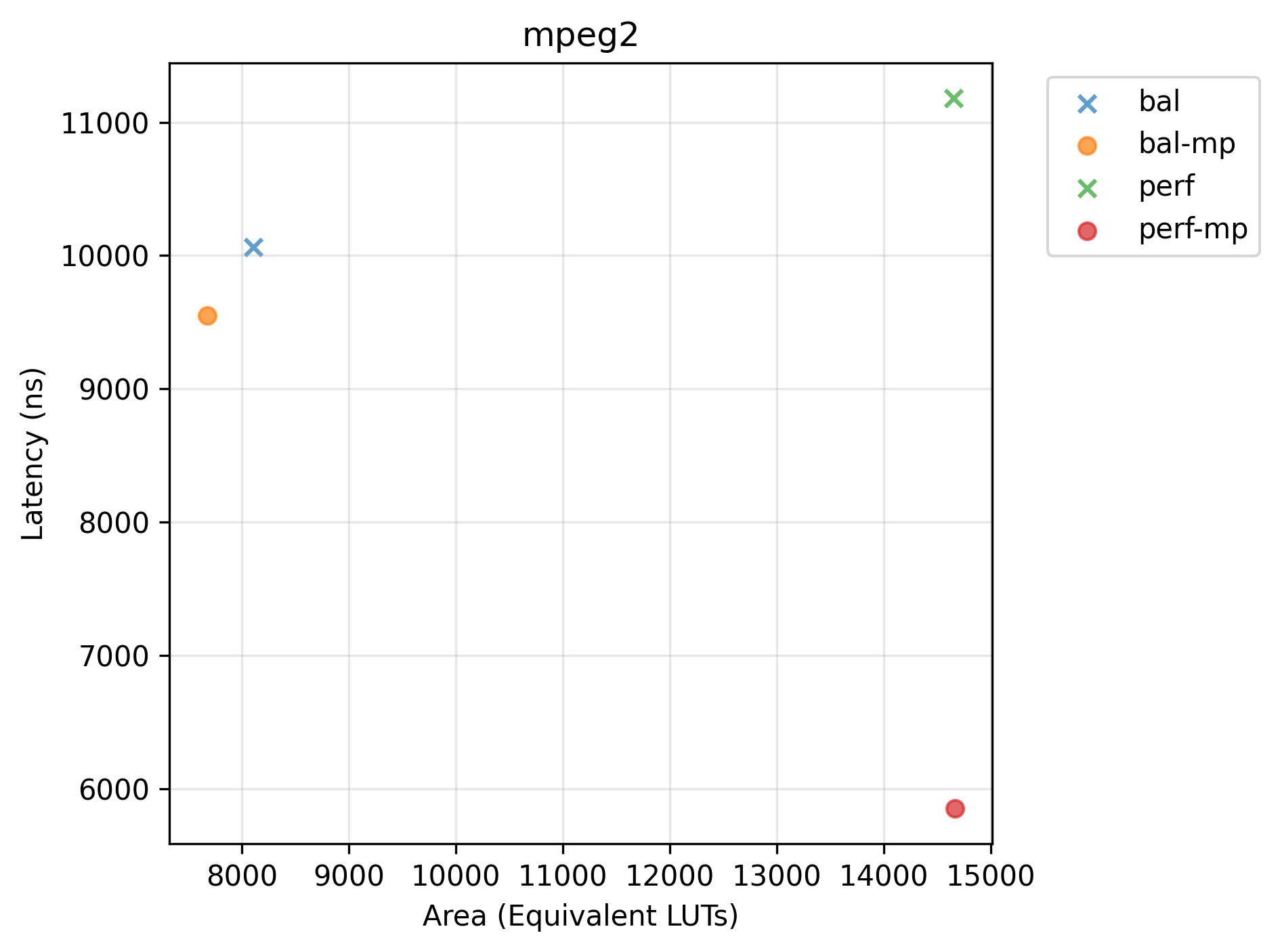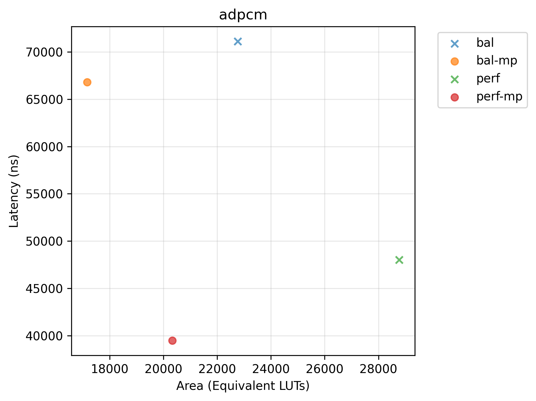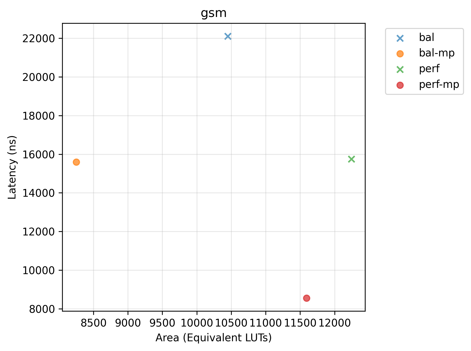 Pareto plots (Latency vs. Area) for selected benchmarks. Points marked with x are dominated.
