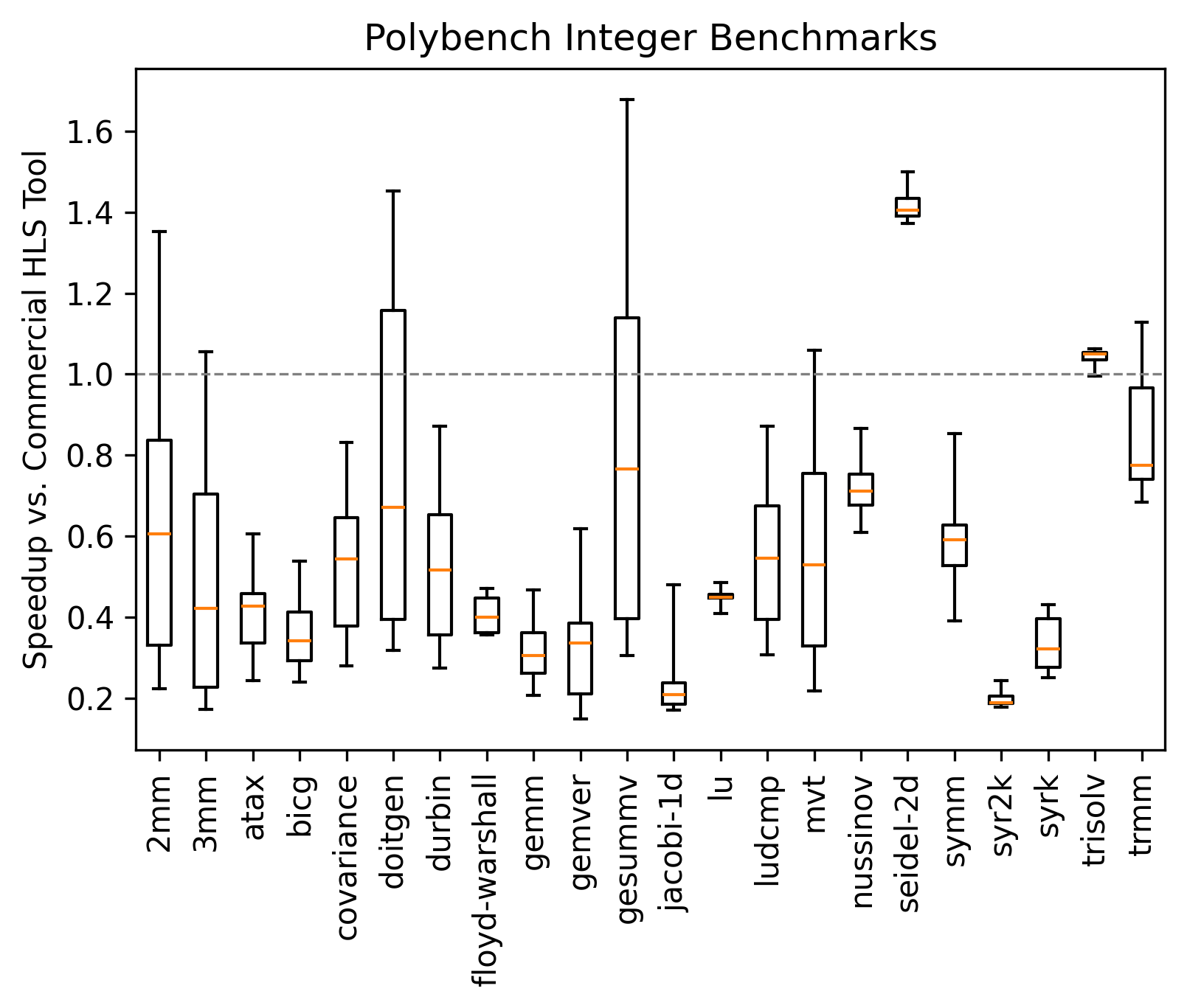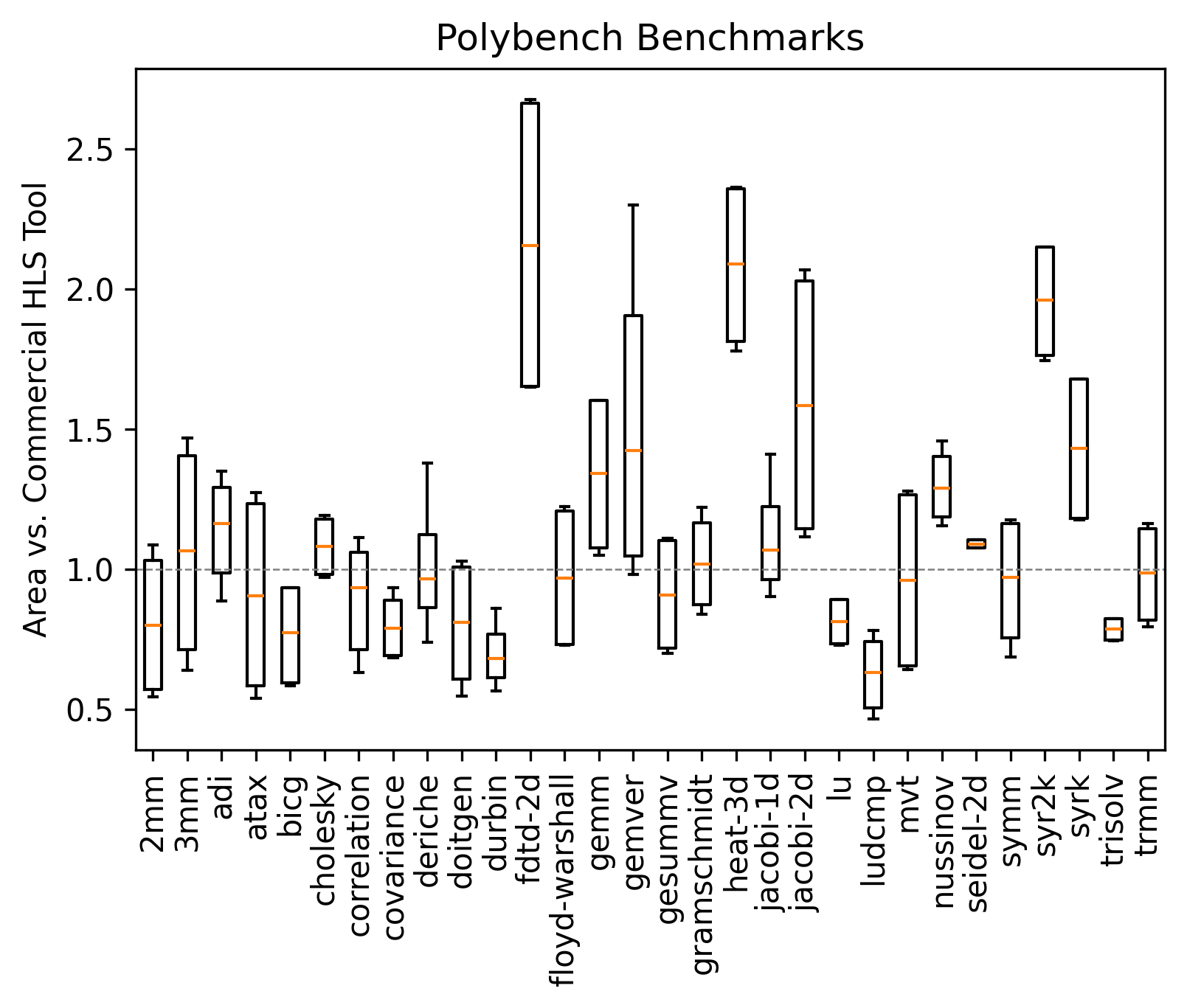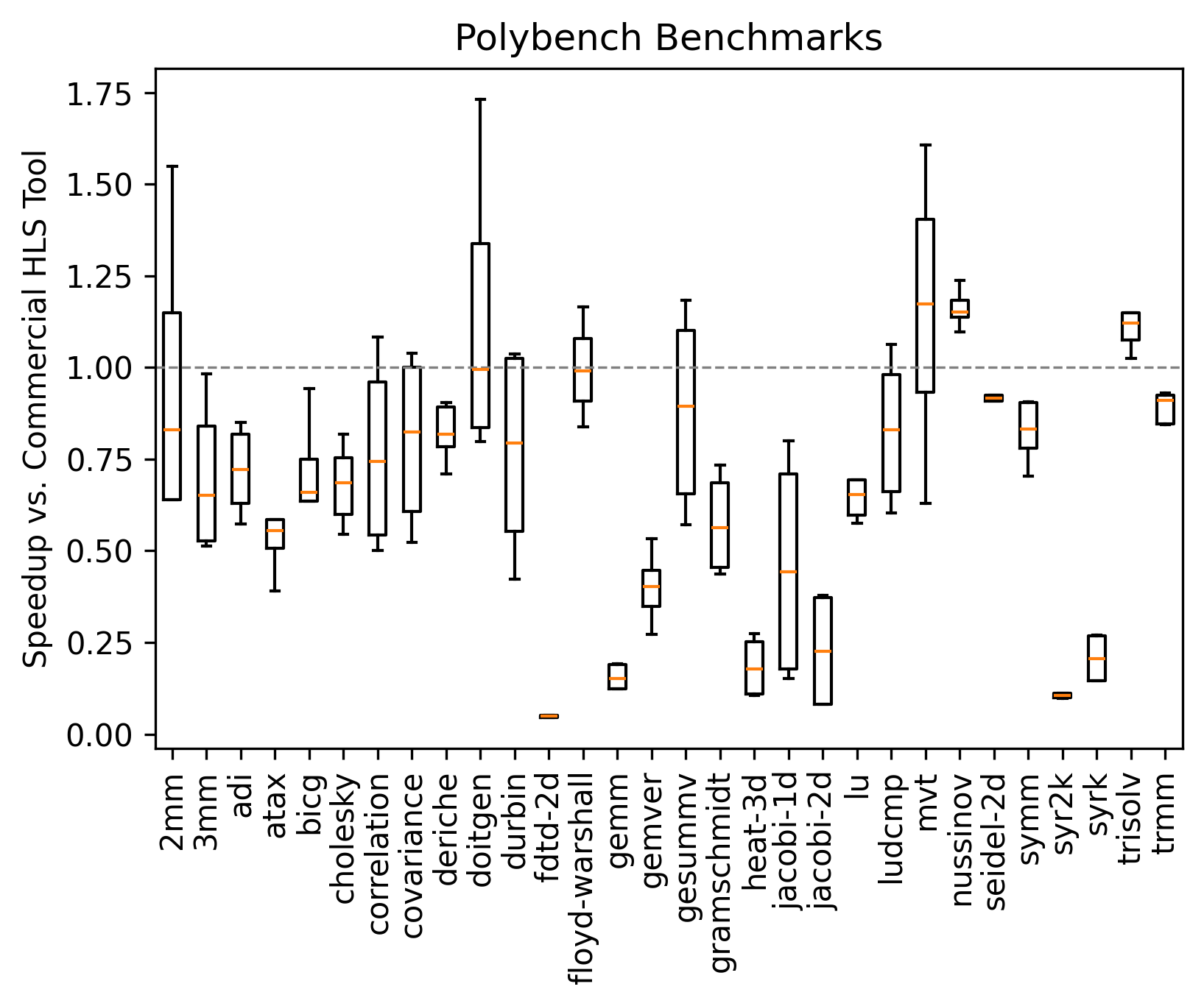 We evaluate accelerators generated by Bambu on the standard benchmark suite PolyBench: