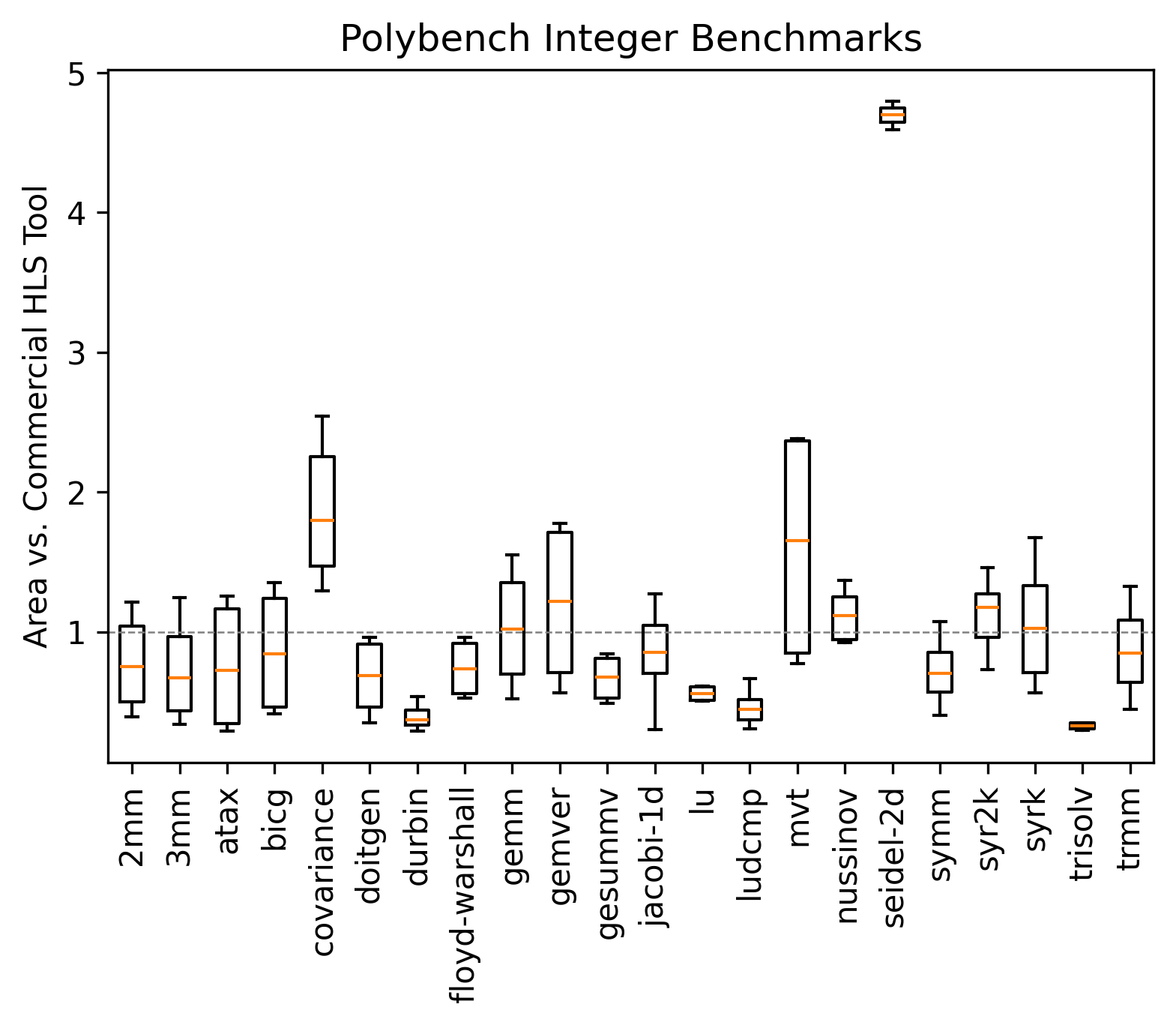 Area consumption over commercial HLS tool for a set of different Bambu configurations across all benchmarks.