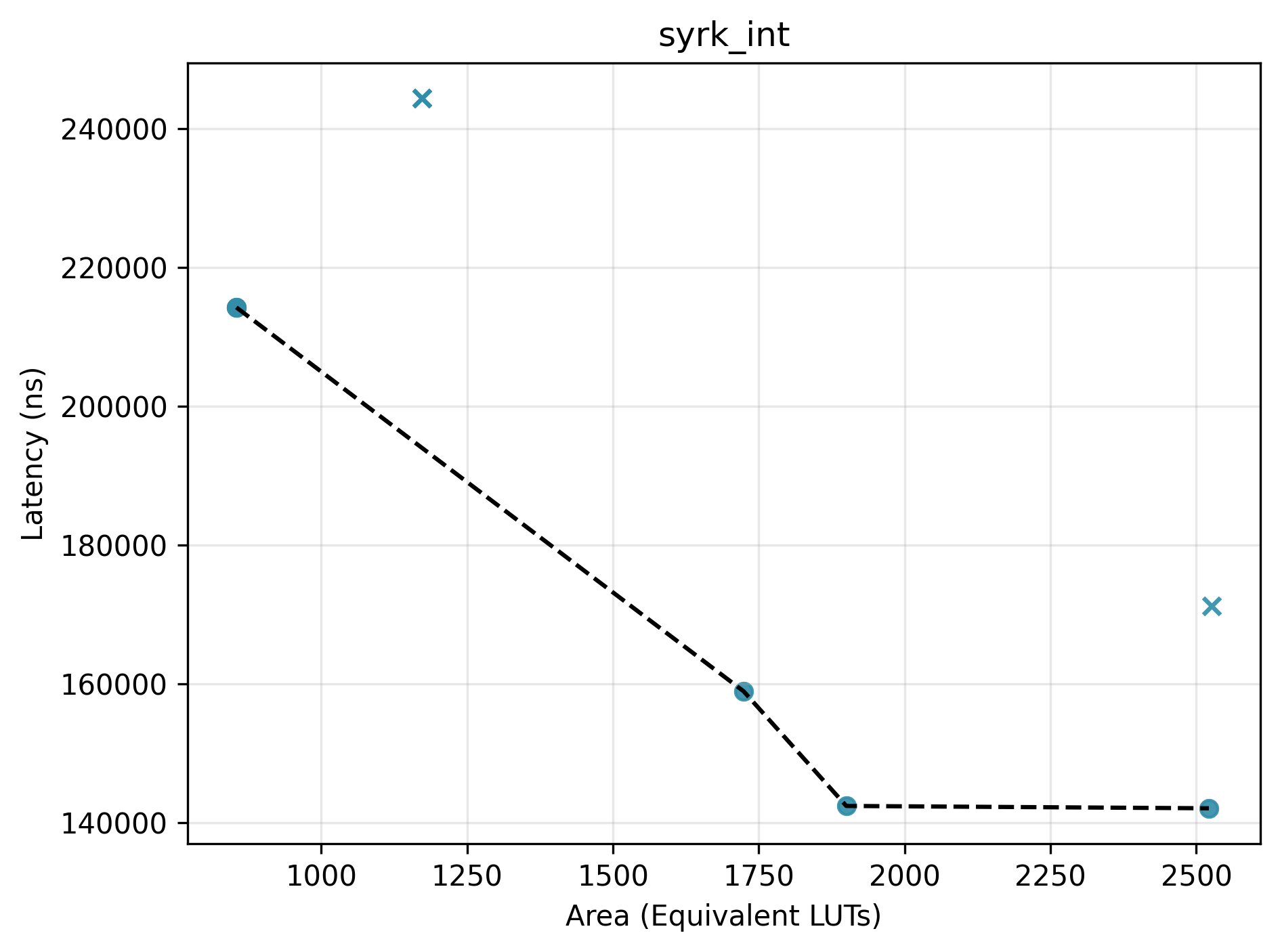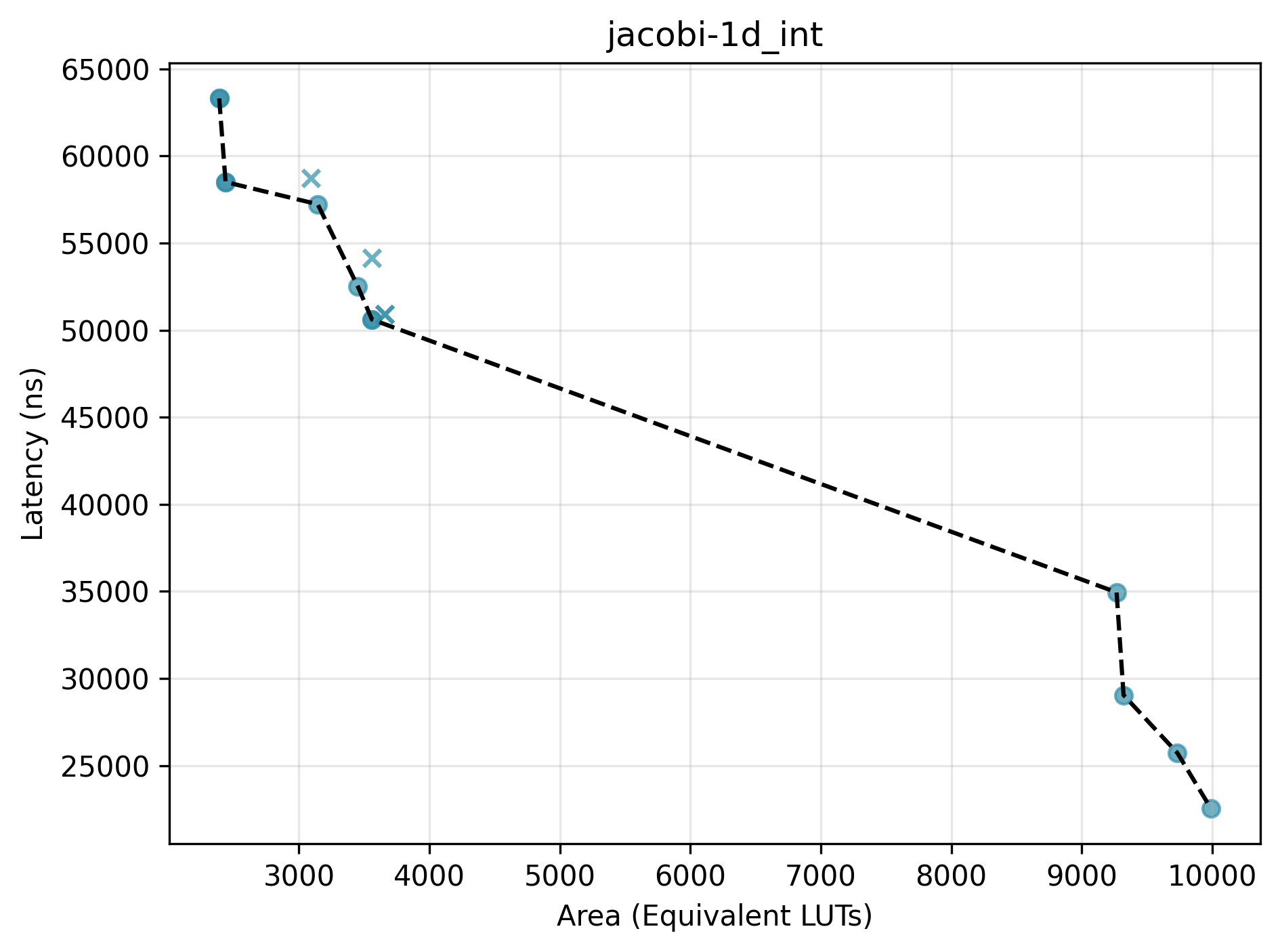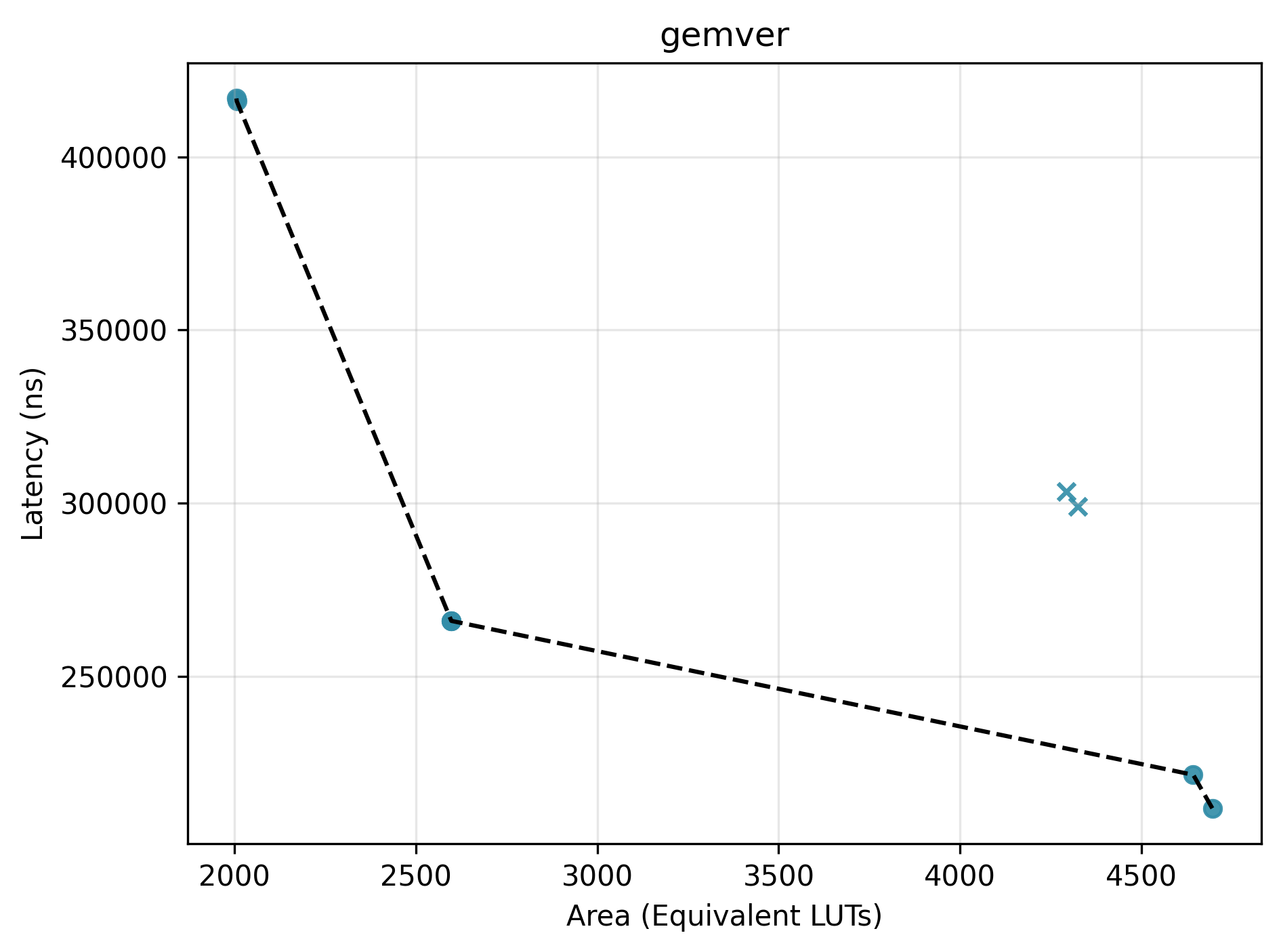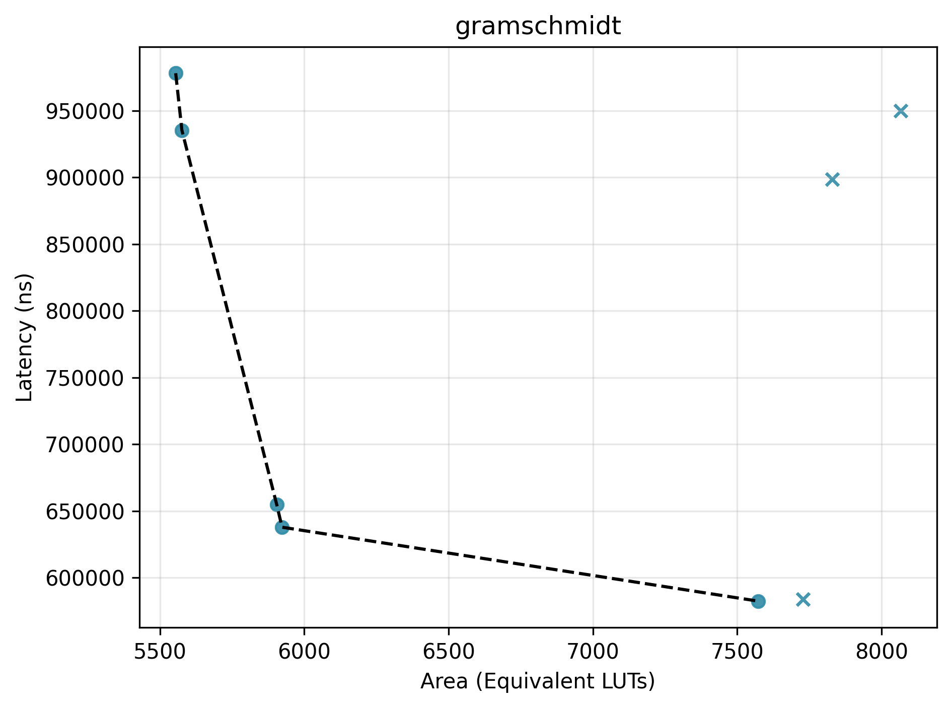 Pareto plots (Latency vs. Area) for selected benchmarks. Points marked with x are dominated.