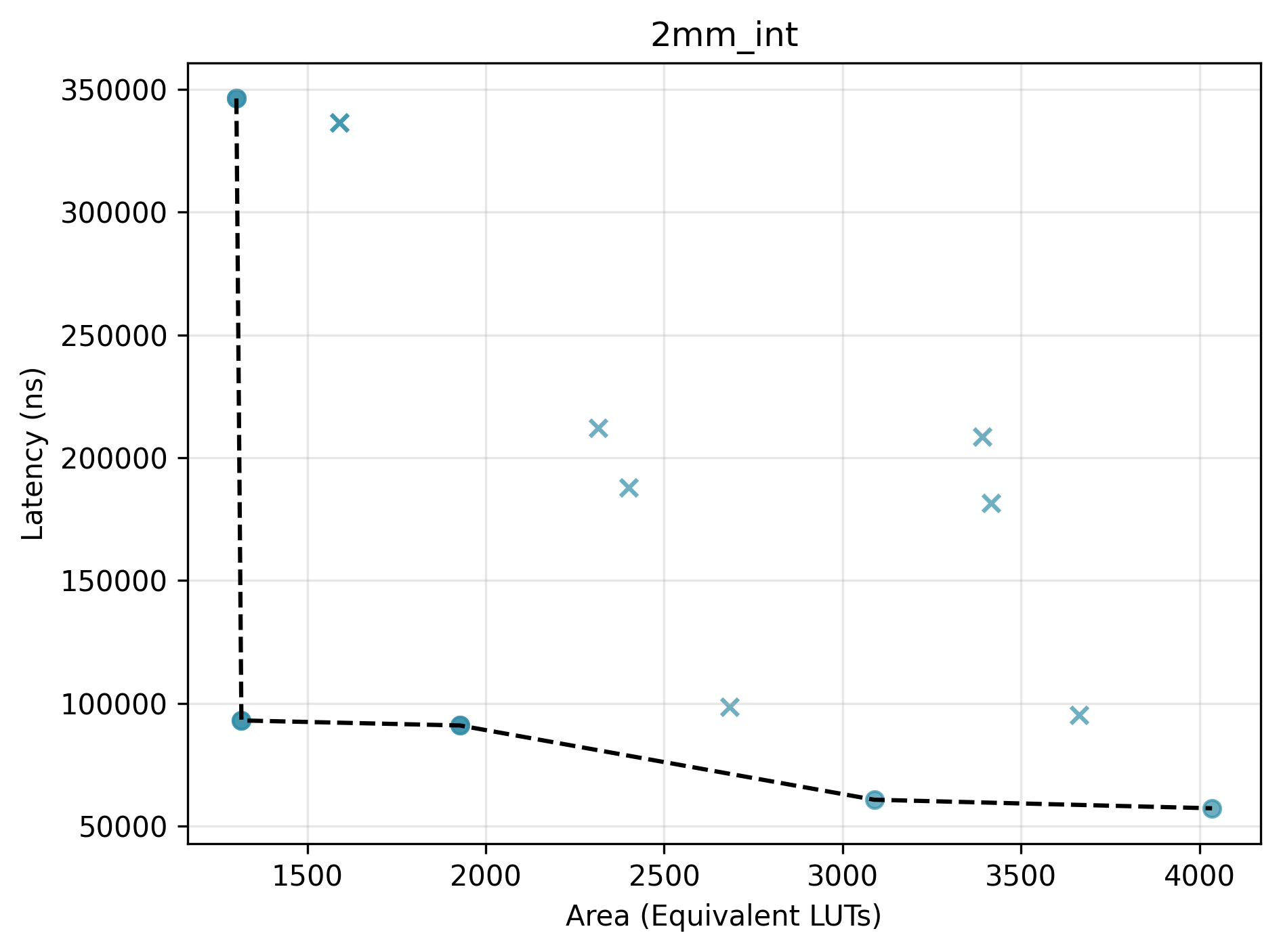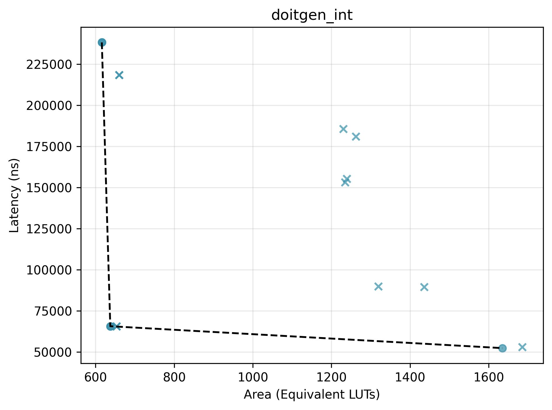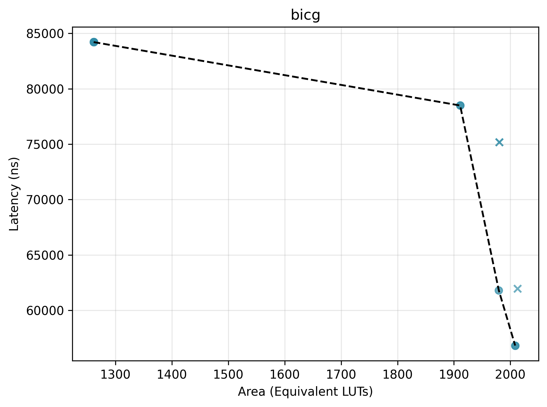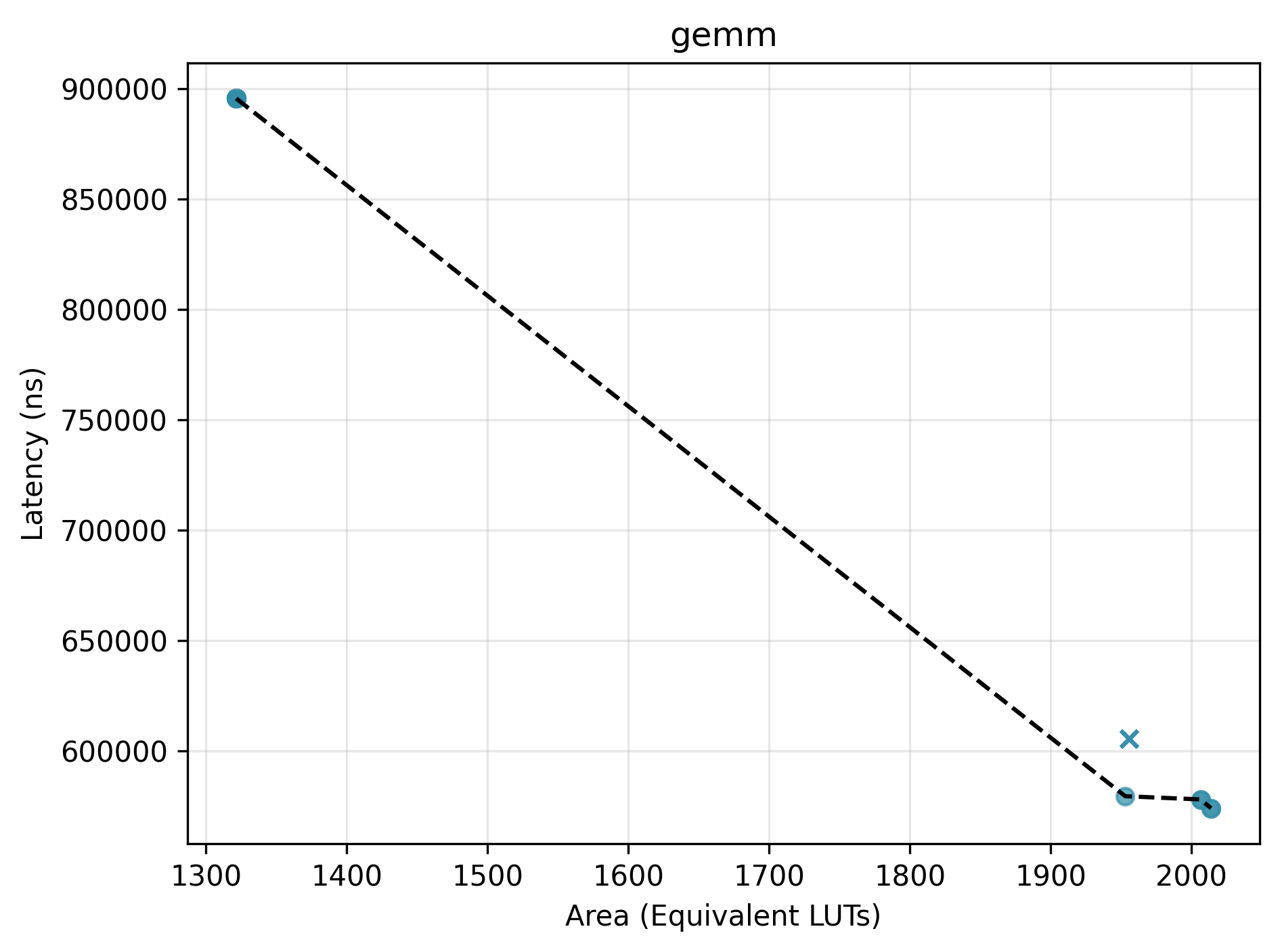 Pareto plots (Latency vs. Area) for selected benchmarks. Points marked with x are dominated.